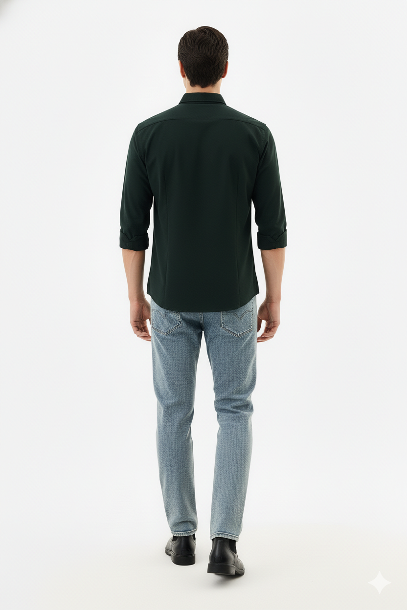 Crafted from high-quality, breathable fabric, the shirt feels soft on the skin while offering excellent durability for daily use. The deep forest green colour adds a refined, masculine touch, making it suitable for both casual outings and smart-casual occasions. Its slim-fit silhouette enhances the body shape, giving a polished appearance whether worn tucked in or left open.