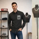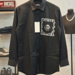 Premium Diesel Promote your street-style game with this premium black button-down shirt. Designed for the modern man who values both comfort and a bold fashion statement, this shirt features high-contrast DIESEL typography and the iconic Mohawk emblem prominently displayed on the chest pocket.