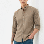 The classic button-down collar and neatly finished buttons add a timeless touch, while the full sleeves can be rolled up for a relaxed, laid-back style. The neutral beige colour makes this shirt extremely versatile, allowing it to be easily paired with jeans, chinos, or trousers for both casual and semi-formal looks.