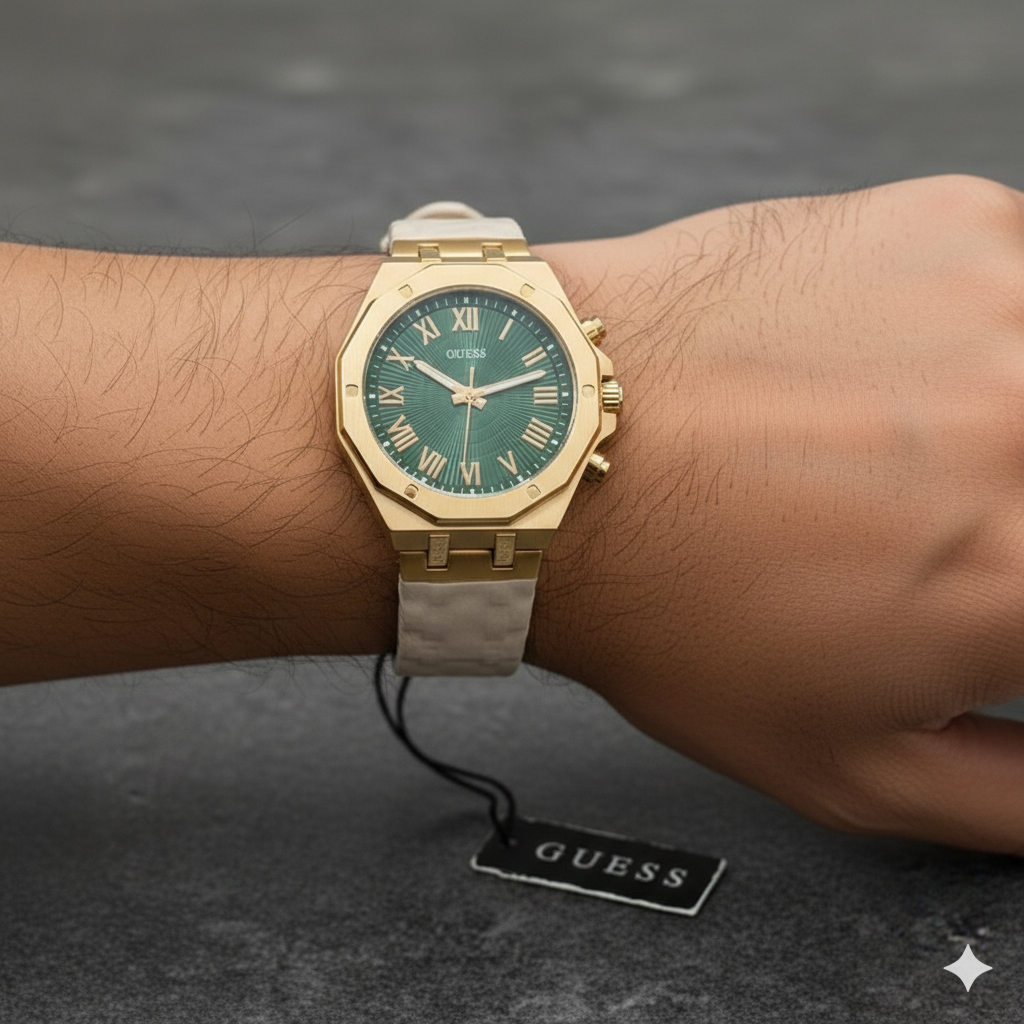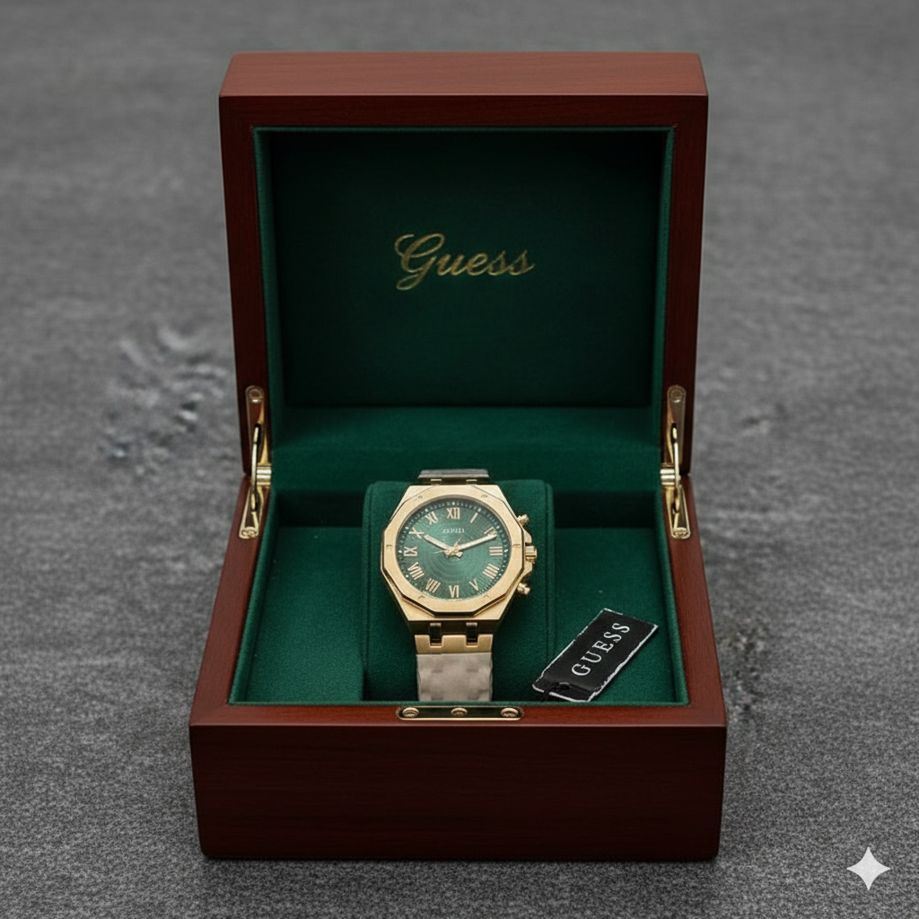 This GUESS premium luxury wristwatch is crafted for individuals who carry class, confidence, and modern style effortlessly. The rich green textured dial, paired with a gold-tone stainless steel case and bracelet, delivers a royal, high-end appearance that instantly elevates your look.