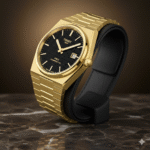 The watch features a striking black dial with a subtle textured pattern that adds depth and character. Sleek gold hour markers and slim hands provide excellent readability while maintaining a clean and minimalist aesthetic. The date window positioned neatly on the dial adds everyday practicality without disturbing the balanced design. A solid gold crown complements the case, ensuring smooth time adjustments and reliable functionality.