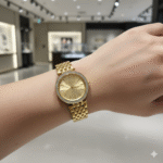 This elegant gold-tone wristwatch is a perfect blend of luxury, sophistication, and timeless design. Crafted with a beautifully polished gold-finish metal bracelet, the watch exudes a premium and refined appearance that instantly elevates any outfit. The bracelet features a sturdy yet stylish link design, ensuring both comfort and durability for everyday wear as well as special occasions.