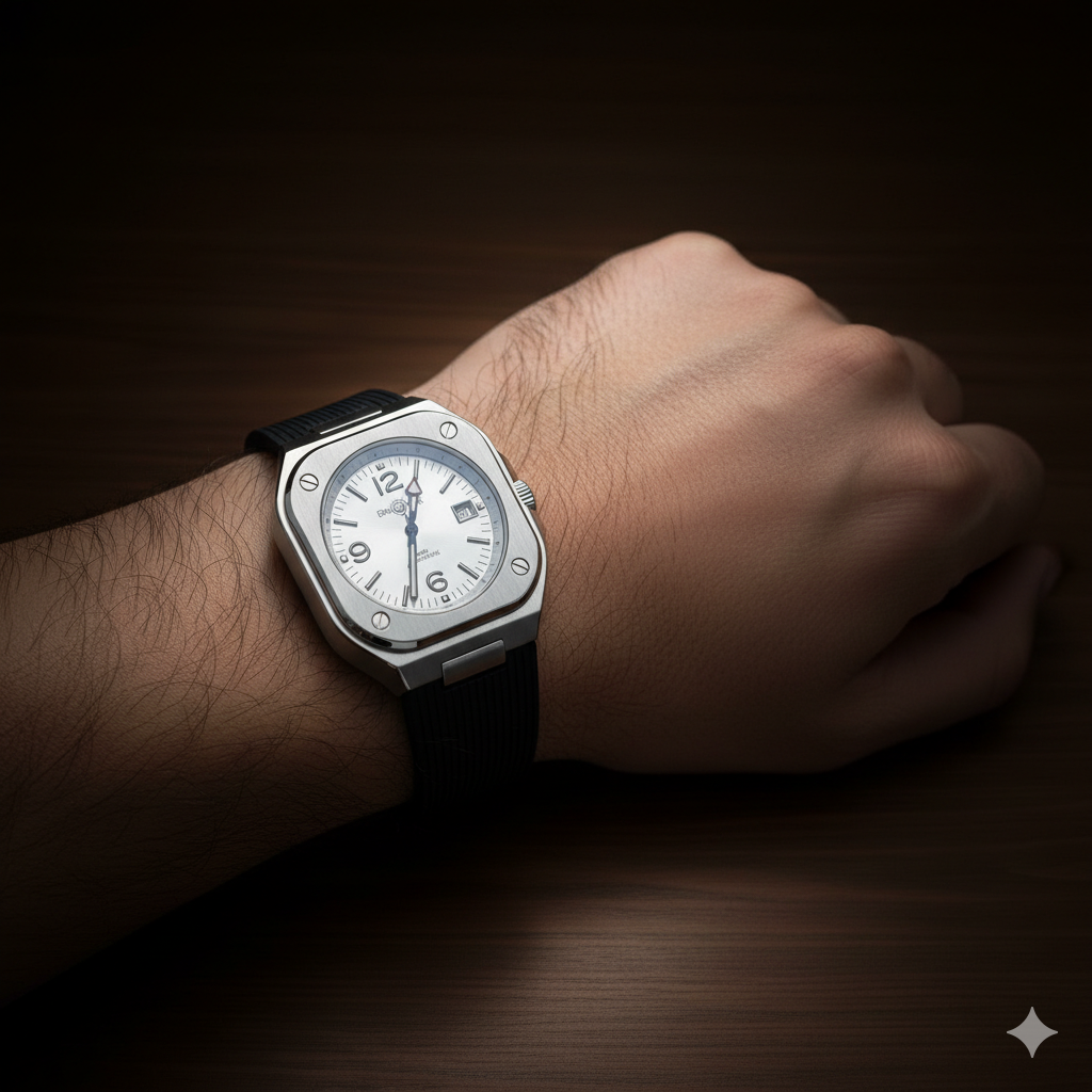 The white dial is thoughtfully detailed with clear hour markers and sub-dial accents that enhance both readability and visual depth. Subtle metallic elements add a refined contrast, while the carefully placed hands ensure accurate and effortless time tracking. The overall dial layout reflects a modern, technical look inspired by performance-driven timepieces.