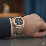 This exquisite luxury wristwatch showcases a perfect fusion of elegance, precision, and modern craftsmanship. Designed with a striking two-tone construction, the watch features a robust stainless steel bracelet accented with refined rose gold center links, delivering a sophisticated and contemporary appeal. The iconic octagonal bezel in polished rose gold adds a bold yet timeless character, making it an instant statement piece for discerning watch enthusiasts.