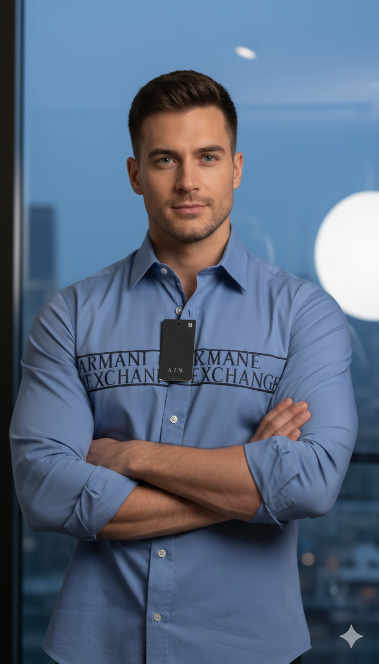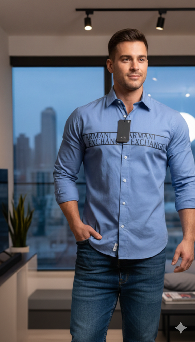 The standout feature of this shirt is the iconic “Armani Exchange” logo printed boldly across the chest, giving it a distinctive and fashionable appeal. The slim-fit tailoring enhances your physique, providing a sharp and structured silhouette. It features a classic button-down front, neatly stitched collar, and full sleeves with buttoned cuffs, combining luxury with everyday practicality.
