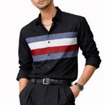 The iconic horizontal stripe detailing in signature Tommy colors across the chest adds a classy designer touch, making it ideal for office wear, formal meetings, evening outings, and smart casual occasions. The rich black base enhances its premium appeal and pairs effortlessly with trousers or denim.